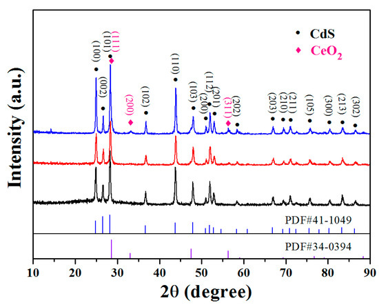 The XRD patterns of pure CdS NWs and CeO2/CdS composites with different CeO2 contents.