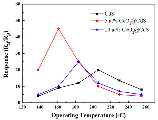 In order to determine the optimum working temperature, the response of CdS and CeO2/CdS NWs to 100 ppm ethanol was measured at different temperatures (138–255 °C). As shown in Figure 3, the response of CdS NWs to ethanol vapor increased with the working temperature and achieved the maximum value at about 206 °C, followed by a decrease with the temperature. As for CeO2-decorated ones, 5 at% CeO2/CdS NWs showed an optimum working temperature of 161 °C, while that of the 10 at% composite was about 183 °C. Ma and co-workers reported Au-decorated CdS prepared by the same method as ours, which worked best around 220 °C with a peak response of 110 [8]. Deng and Liu et al. recently investigated the enhanced ethanol sensing properties of ZnO-based composites, and both of the optimum working temperatures were higher than 220 °C [14,15]. In contrast to this past research, the presented CeO2/CdS NWs exhibit a much lower working temperature. This improves the security and reduces the energy consumption for the sample in device application. However, the response of CeO2/CdS NWs still has room to be strengthened. In addition, at the optimum working temperature, the 5 at% composite shows notably higher sensitivity than the pure sample, indicating that the decoration of CeO2 on CdS NWs is beneficial for the enhancement of ethanol detection.