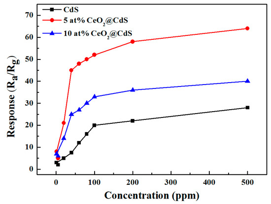 The response of the sensors versus different ethanol concentrations at the optimum working temperature is shown in Figure 4. The response rises upon increasing the ethanol concentration from 1 to 200 ppm. The response increase slows down and gradually saturates above 200 ppm. Moreover, the 5 at% CeO2/CdS NWs display a much higher response with the maximum value of about 52 to 100 ppm ethanol vapor (2.6 times larger than that of pure CdS).