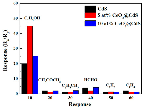 The selectivity of a gas sensor is one of the important parameters to evaluate in the sensing performance of semiconductors. The response of pure CdS NWs and CeO2-decorated NWs to different gases is shown in Figure 5. The detected gases are ethanol (C2H5OH), acetone (CH3COCH3), toluene (C6H5CH3), formaldehyde (HCHO), ethyne (C2H2), and tetrahedrane (C4H4) with a concentration of 100 ppm, respectively. As shown in this figure, the composite sensors exhibit a much larger response to ethanol than to other interfering gases. On the one hand, CdS detects ethanol efficiently by catalyzing the decomposition of ethanol molecules. On the other hand, the decoration of CeO2 would effectively dehydrogenate ethanol molecules and then significantly improve the selectivity towards ethanol.