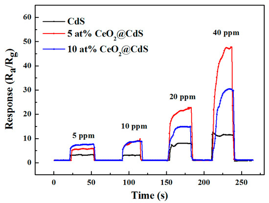 When the ethanol concentration is as high as 40 ppm, the composite with fewer CeO2 adhesions shows a higher response. On this occasion, too many CeO2 particles would occupy the reactivity sites on the CdS surface, which in turn lowers the response. While at low ethanol levels, the active site is adequate in the chemical reaction, and the impact of CeO2 content on the response is not obvious. Compared with the one-dimensional structured CdS NWs, the longer response time of composites is possibly ascribed to the numerous grain boundaries generated after CeO2 decoration, which slows down the electron transport.