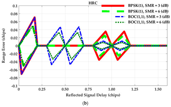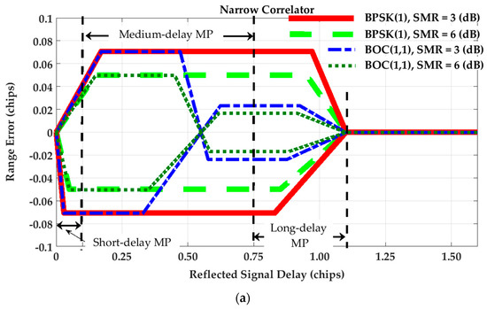 According to Figure 1, the error envelopes are almost the same for all tracking strategies and signaling schemes for short-delay multipath. For path delays longer than approximately 0.5 chips, the corresponding tracking range error for the BOC(1,1) modulation is about one third of that of the BPSK(1) signal. This is because of the difference in the shape of correlation peaks for BPSK(1) and BOC(1,1). For the HRC technique, the maximum tracking range error is the same for both signals under the effect of short-delay multipath. Regarding medium-delay multipath, the BPSK(1) outperforms the BOC(1,1) signal as the resulting ranging error is reduced to zero. However, under long-delay multipath, the tracking range error of the BOC(1,1) is significantly lower than that of the BPSK(1) signal.