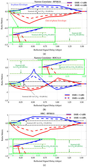 - In the case of the HRC discriminator, for BPSK(1) signaling, the SQM methods are not effective for medium-delay multipath due to negligible ranging errors. In this scenario, relying on SQM detection to de-weight or exclude measurements may even increase position errors due to geometry degradation. For BOC(1,1), the SQM can be effective for some intervals of medium-delay multipath when tracking range error envelopes take non-zero values. For long-delay multipath, comparing BPSK(1) and BOC(1,1) schemes, a lower SQM performance is observed for BOC(1,1) where the sensitivity of the SQM metrics is less and the multipath performance of the BOC(1,1) is significantly better than that of the BPSK(1).