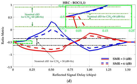 SQM variation envelopes of (single-sided) Ratio metric for (a) Narrow Correlator (NC) tracking strategy and BPSK(1) signaling; (b) Narrow Correlator (NC) tracking strategy and BOC(1,1) signaling; (c) High Resolution Correlator (HRC) tracking strategy and BPSK(1) signaling; (d) High Resolution Correlator (HRC) tracking strategy and BOC(1,1) signaling.