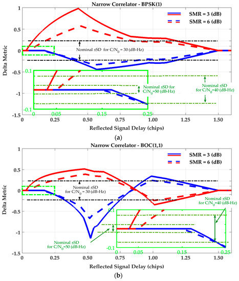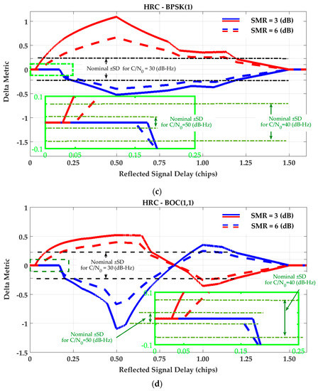 SQM variation envelopes of Delta metric for (a) Narrow Correlator (NC) tracking strategy and BPSK(1) signaling; (b) Narrow Correlator (NC) tracking strategy and BOC(1,1) signaling; (c) High Resolution Correlator (HRC) strategy and BPSK(1) signaling; (d) High Resolution Correlator (HRC) strategy and BOC(1,1) signaling.