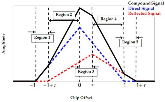 Inspection of the Delta and Double-Delta SQM envelopes in Figure 3 and Figure 4 shows that SQM outputs are zero (or below the nominal SDs) for some intervals of short-delay multipath. This multipath period induces range errors that are not detectable by SQM metrics. To elaborate on this phenomenon, consider Figure 5 which shows a BPSK(1) correlation function affected by multipath and divided into different regions. For BPSK(1) with the narrow correlator scheme, [31] showed that for short-delay multipath, the in-phase tracking range error envelope linearly increases from zero to ( is the ratio of reflected and LOS signal amplitudes and is the early-late tracking correlator spacing) with respect to the multipath signal delay (). Considering this, it can be shown that for , when is hold ( is the monitoring correlator spacing), both early monitoring and tracking correlators are located in Region 2 and late tracking and monitoring correlators are both located in Region 4. Under these circumstances, since the correlators located in Regions 2 and 4 are affected by multipath symmetrically, the early-minus-late value for monitoring pairs of correlators will be equal to the tracking ones, resulting in zero output for the double Delta SQM metric. Even for the Delta metric, since DLL keeps the tracking early-minus-late value around zero, monitoring early-minus-late values will be kept around zero as well. For , depending on multipath delay and correlator spacing, the early correlators will mutually be in different regions or late correlators will be in different regions or early late correlators will be affected by the multipath correlation curve asymmetrically, resulting in non-zero SQM envelopes. This will occur until when the multipath correlation curve has no overlap with tracking and monitoring correlators anymore. Using a similar argument, it can be shown that the out-of-phase envelope takes a zero value for . A similar argument can be made for the HRC discriminator and BOC(1,1) signaling schemes.