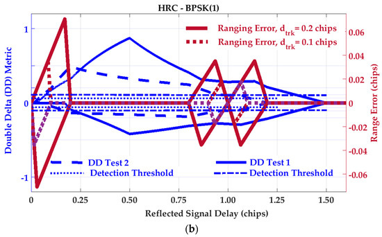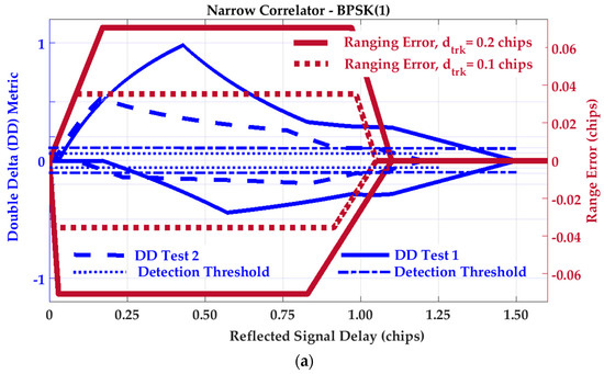 Consider the Double-Delta (DD) metric for BPSK(1) signaling. To evaluate the effect of correlator spacing on the SQM effectiveness, two sets of correlator spacings are considered according to Table 2. In addition to the previously defined DD metric (Test 1), Test 2 is defined based on 0.1 and 0.4 chips tracking and monitoring the correlator spacing, respectively. The nominal statistics of Test 1 and Test 2 are summarized in Table 2. Figure 6 shows the SQM profiles of the Double-Delta Test 1 and Test 2 for SMR = 3 dB and BPSK(1) signaling (blue solid and dashed lines). For a better comparison, the corresponding ranging error envelopes are also plotted on the right-hand vertical axis in brown. For a C/N0 value of 45 dB-Hz, detection thresholds have been set as three times the corresponding nominal SD to satisfy a probability of false alarm of 0.0027.