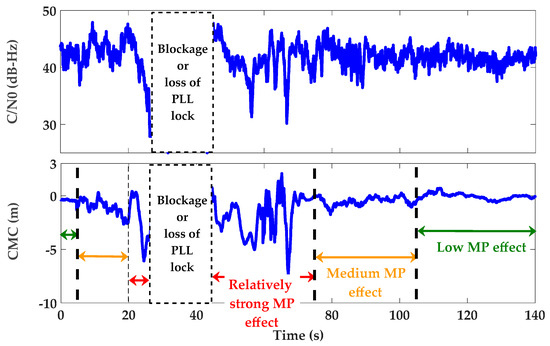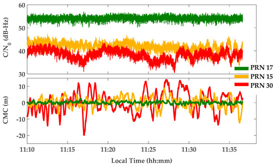 Figure 8 shows Carrier-to-Noise-density ratio (C/N0) and Code-Minus-Carrier phase (CMC) measurements for a sample of PRNs. The C/N0 values are computed based on a classic technique known as the Narrowband-Wideband Power Ratio (NWPR) method [34]. CMC is a well-known technique to characterize and measure code multipath errors [35]. To this end, carrier phase measurements are subtracted from the corresponding pseudorange measurements. The results include code and carrier noise and multipath errors, carrier phase ambiguities and twice the ionospheric errors (due to ionospheric code delay and phase advance). The effects of ambiguity and ionosphere are estimated and removed using polynomial curve fitting. Neglecting the effect of carrier phase noise and multipath errors, the resulting value will be a measure of code multipath and noise.