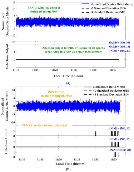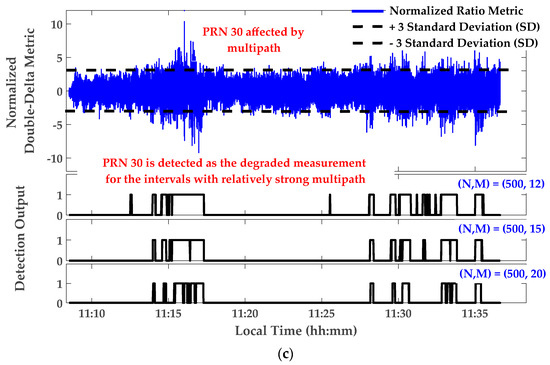 Figure 9 shows monitoring results for the Double Delta metric defined in Table 1. Similar results, not presented here, were observed for Ratio and Delta metrics. In Figure 9, the Double-Delta metric outputs were calibrated and normalized using its theoretical variance according to Table 1. In this normalization, the C/N0 values were smoothed using a moving average window of 60 s. Afterwards, detection thresholds were fixed to times the Standard Deviation (SD) for the normalized metrics. The M of N detection strategy was used with N = 500 samples (or 10 s) and M = 12, 15 and 20, the overall probability of false alarm would be respectively. As shown in Figure 9a, the output of the designed detection algorithm for relatively clean PRN 17 is zero for all epochs, identifying this PRN as a clean measurement. The detection output for PRN 15 and 30 are shown in Figure 9b,c, respectively. It is observed that, while PRN 15 with medium multipath (according to its CMC measurement) remains almost undetected, PRN 30 is detected as the affected measurement for the intervals with strong multipath. It is also observed that the aforementioned decision procedure detects multipath with a delay related to the length of the moving window in the detection strategy.