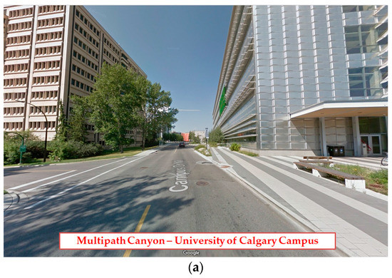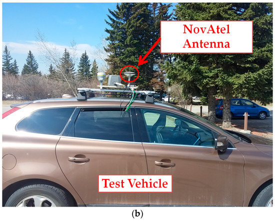 (a) Kinematic data collection—Multipath canyon—University of Calgary; (b) Test vehicle and NovAtel antenna for GPS data collection.