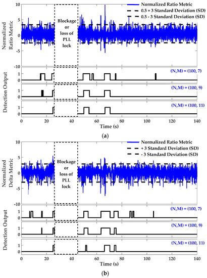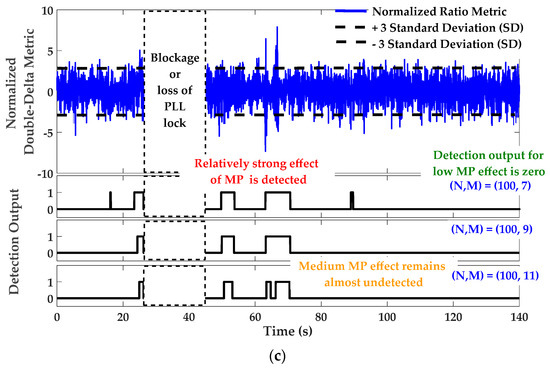 - The multipath detection process can be considered as a general maximizing procedure of the likelihood ratio by setting an appropriate detection threshold for each PRN. By setting this threshold, the SQM threshold excess can be monitored as a primary real-time indication of anomaly detection. However, to optimize detection performance and have more reliable detection (in terms of false alarm and detection probability), a filtering process should be applied at the expense of delayed decision-making. Herein, the detection procedure is defined based on a fixed interval detector called the M of N detection strategy usually used in GNSS acquisition procedures [32]. The M of N search detector takes a window of N samples and compares them to a predefined threshold. If M or more samples exceed the threshold, then the detection output will be 1 and otherwise 0. This procedure is repeated for the next window in the search pattern. With this detection strategy, the overall probability of false alarm in N trials is [32]:where is the binomial coefficient of n and N integers referring to the number of combinations of N items taken n at a time. is the false alarm probability in each trial equals to 0.27% under a normal distribution assumption for the SQM metric and 3 times the standard deviation () as the detection threshold.