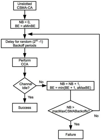 Considering the unslotted version of the IEEE 802.15.4 standard, the medium access algorithm follows the flowchart shown in Figure 1.