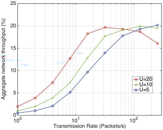 Aggregate network throughput for different transmission rates and number of nodes (U). The aggregate network throughput is defined as the percentage of time in which the channel is occupied with a successful packet transmission.