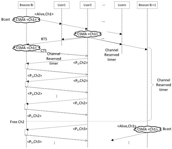 The considered scenario includes a specific number of users and infrastructure beacons that broadcast periodically packets showing their availability. The first user that reserves the beacon using a RTS/CTS packet exchange gains the channel access during a period of time that is long enough to send and receive N packets at every power level L, at the first channel of the group of K channels selected. This process can be seen in Figure 3, where a possible example is presented. In this case, beacon Bi announces its availability transmitting broadcast packets at channel Ch1. This is represented in Figure 3 with the symbol (CSMA <Ch1>) and the packet <Alive,Ch1>, which indicates the transmission of the packet Alive using the CSMA protocol. After the reception of this broadcast packet, User2 reserves the beacon Bi using the RTS/CTS mechanism. This process involves the transmission of two packets RTS and CTS using the CSMA protocol. All the rest of users and beacons that have received the RTS or CTS packets start a timer with an overflow time equal to the Channel Reserved time. During this period, beacons stop the transmissions of broadcast packets because the channel is occupied.