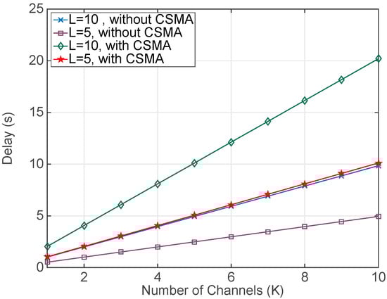Delay to collect the RSSI values with different number of channels (K) and power levels (L). The number of retransmissions (N) at every combination of channel and power level is fixed and equal to 10.