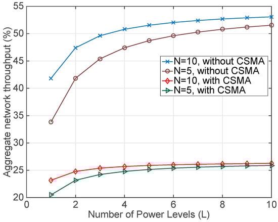 Aggregate network throughput with different power levels (L) and number of retransmissions (N) (10 or 5). The number of channels is fixed (K = 1) for all the combinations of L and N. The aggregate network throughput is defined as the percentage of time in which the channel is occupied with a successful packet transmission.