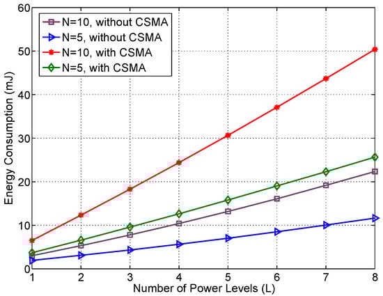 Energy consumption for different number of power levels (L). The number of frequency channels (K = 1) and beacons (B = 1) remained fixed. There were two numbers of retransmissions (N = 5) or (N = 10) and 8 power levels: (−25 dBm, −15 dBm, −10 dBm, −7 dBm, −5 dBm, −3 dBm, −1 dBm, 0 dBm). Power levels are added in order, i.e., the case with only one power level uses −25 dBm, the case with two power levels includes transmissions with −25 and −15 dBm and so on.