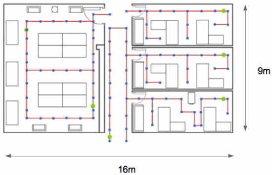 The proposed protocol has been evaluated experimentally in our facilities. The experimental setup includes an area consisting of three offices, a large laboratory and part of the main corridor. The considered scenario covers a rectangular box-shaped area of dimensions 9 m × 16 m, which is divided by walls and contains furniture, as it is shown in Figure 8.
