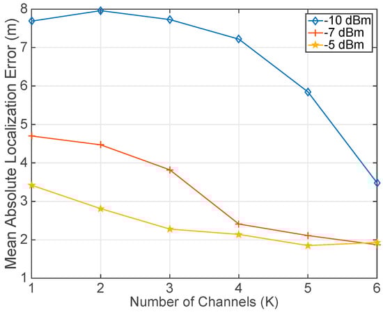 Mean Absolute Localization Error for different numbers of frequency channels (K). The number of retransmissions (N = 5), power levels (K = 1) and beacons (B = 6) remained fixed for each different line in the graph. Three lines are presented according to three different power levels: (−10 dBm, −7 dBm, −5 dBm). Channels used are: [11 (2405 MHz), 13 (2415 MHz), 16 (2430 MHz), 19 (2445 MHz), 22 (2460 MHz), 26 (2480 MHz)]. Channels are added in order, i.e., the case with only one channel uses channel 11, the case with two channels includes channels 11 and 13, and so on. Localization was carried out after transmitting and receiving all the packets exchanged between one user and six beacons.