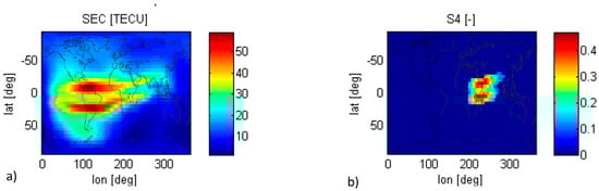 However, the accuracy of this correction used in navigation receivers, still needs to be validated, because the ISS height varies in time from 330 to 460 km, and it is in the middle of the ionosphere peak (maximum TEC). Figure 3a shows a global map of TEC computed using the Global Ionospheric Scintillation Model (GISM) [] for 28 February 2015, at Universal Time UT = 6 AM. Note that maximum TEC content occurs around noon (local time), and around 20° North/South of the magnetic equator.