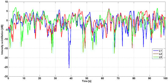 Finally, Figure 4 presents simulated amplitude scintillations at L1/E1, L2/E2 and L5/E5 bands computed for and σφ = 0.1 rad. As it can be observed, large intensity fadings occur, and they are different at different frequency bands (i.e., 1575.42 MHz for L1/E1 at 1176.45 MHz for L5/E5a). They are closer among L2/E2 and L5/E5 because these frequencies are much closer. When the fading is large, the signal-to-noise ratio decreases, the range estimates get worse, and eventually, the signal may be totally lost, although often the SNR degradation is just a few dB. This effect cannot be calibrated using the up-looking antenna since the reflected signal passes through the ionosphere twice (completely in the down-welling path, and through most of it in the up-welling path depending on the orbital height), while the direct signal suffers much smaller ionospheric disturbances as it is only affected by the tenuous fraction of the ionosphere above the receiver.