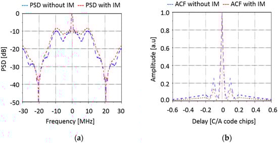 Figure 6. (a) Power Spectral Density (PSD), and (b) squared auto-correlation function (ACF) of the composite GPS L1 signal with and without considering the IM component (Adapted from []).