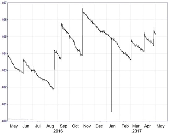 The decay rate of the ISS can vary significantly along time, with sharp vertical transitions corresponding to orbit re-boosts to move the ISS to higher altitudes (e.g., Figure 7, from http://www.heavens-above.com/IssHeight.aspx). During solar maximum conditions, the ISS loses 400 m of altitude per day (4.63 mm/s), while during sunspot minimum conditions the rate is only 80 m per day (0.92 mm/s). These values will have to be taken into account during the long incoherent integration times foreseen in GEROS-ISS (~13.6–14 s for a dwell line of 100 km), and when computing the statistics of GEROS-ISS estimated height at different time instants. In practical terms, from an implementation point of view of the receiver it will require to split the incoherent averaging period into shorter integration times, and realign (re-track) the waveforms, before performing the second incoherent averaging [].