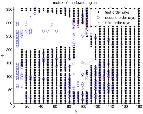 Graphical representation of the directions of arrival of direct signal or first order rays (no reflections) (·), second order rays (one reflection) (o), and third order rays (two-reflections) (x). Empty areas correspond to shadowed directions blocked by the ISS structure.
