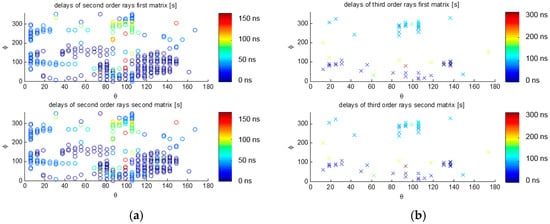 (a) Delays for the second order rays, and (b) for the third order rays. Direction of Arrival (θ, φ) in the antenna far field. Co-polar antenna pattern used for the direct and third order rays, cross-polar pattern used for the second order rays. Top: first matrix and bottom: second matrix, refer to the fact that there are second order and third order rays that have the same far field direction, but enter through different directions in the antenna pattern reference frame. Color code corresponds to the delay in ns.