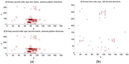 Simulation results are shown in Figure 9 and Figure 10, where the notations of dot, circle o, and cross x indicate the directions of arrival of the direct signal, the second, and third order reflections, respectively (i.e., arrive to antenna after one, or two reflections). Empty areas correspond to shadowed directions blocked by the ISS structure. Note that two of the latest second order reflections occur at delays of ~150 ns and (θ, φ) ≈ (100°, ±90°), from the closest solar panels. The latest third order reflection occurs at a delay of ~300 ns and (θ, φ) ≈ (100°, 90°), again from the closest solar panel. The impact in the waveforms (or delay Doppler maps) is tricky to imagine intuitively, because of the different amplitude (in case of diffraction), and phases of each reflection, and because the scattered fields’ polarization changes, so it is collected through the co- or cross-polar antenna patterns.