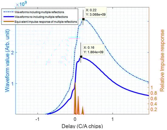 For illustration purposes, assuming that for the direct signal, and for the far-field direction of the scattered signals. In this case, there are first and third order reflections from the scattered signals, and first and second order reflections from the direct signals. For the scattered signal, the direction of arrival of the third order reflection is , and the delay (56 m = 0.19 coarse/acquisition chips or C/A chips). For the direct signal, the direction of arrival of the second order reflection is and the delay (24 m 0.08 C/A chips). Note that , i.e., the second order rays (single reflected) of the direct signal can be collected via down-looking antenna. Taking into account this multiple reflection, the simulation results are show in Figure 12. The waveform affected by multipath (light blue dash-dot line) is calculated as the convolution of the waveform (dark blue solid line) and (red peaks). Because of the multipath, the waveform peak increases by a factor of 1.7, and it is delayed by 0.06 C/A chips (=18 m), which is not negligible at all for altimetry purposes. The altimetric delay is found by the peak of the waveform derivative, and not by the waveform peak itself.