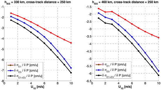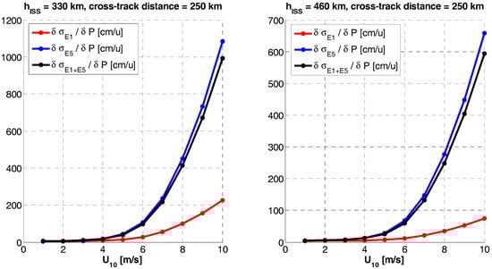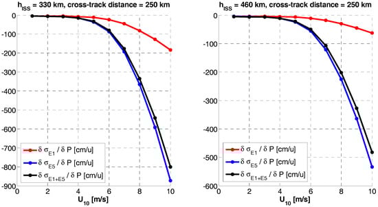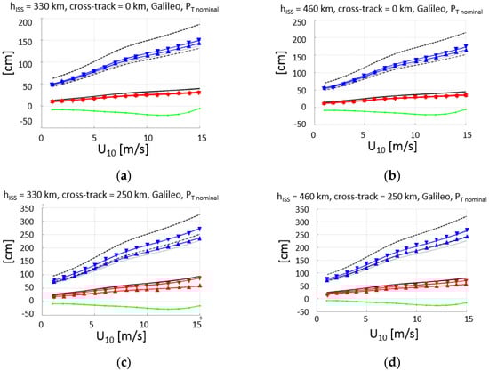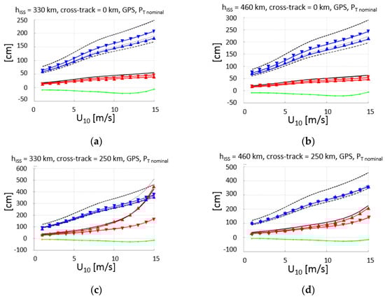 Following the same procedure as in [], and taking into account the effects discussed in Section 2.4.1 and Section 2.4.2, properly compensated for, the altimetry performance is computed for the nominal transmitted powers of the GPS (Figure 13) and Galileo (Figure 14) constellations, for the minimum (330 km) and maximum (460 km) ISS orbital heights, which require the maximum and minimum antenna off-boresight angles to satisfy the ±250 km swath requirement.