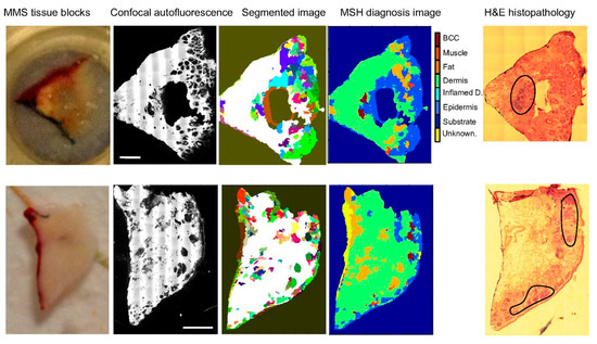 Multimodal Spectral Histology (MSH) diagnosis of BCC in unsectioned tissue blocks as received from surgery. H&E histopathology images for adjacent sections are included for comparison. (Scale bars: 2 mm.) Figure reproduced from Kong et al., [28].
