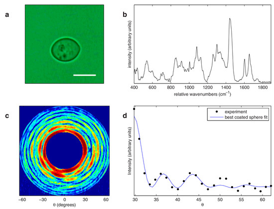 IRAM measurements of Saccharomyces cerevisiae. (a) Bright field image of the measured yeast cell. Scale bar indicates 5 μm. (b) Raman spectrum from the yeast cell shown in (a). (c) Elastic scattering pattern from the yeast cell (color scale runs from blue (low) to red (high)). (d) Azimuthally averaged data from (c) (black dots) and associated best fit using a coated sphere model (solid blue line), with extracted core and coat diameters of 6.06 and 6.22 μm, respectively. Reprinted from Smith et al., [94], with the permission from AIP Publishing.