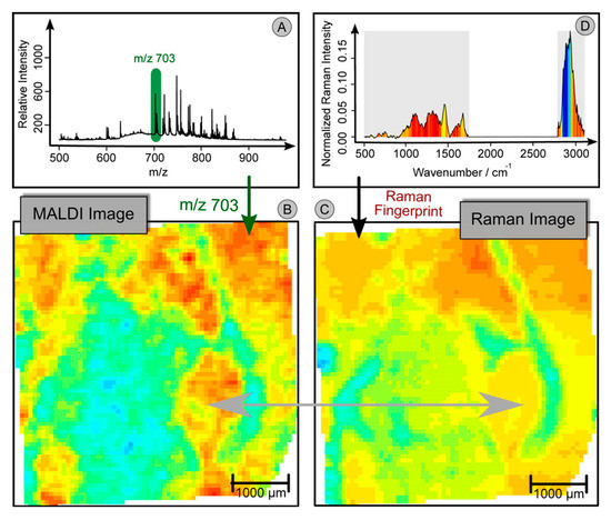 - Bocklitz, T.W.; Creceius, A.C.; Matthaus, C.; Tarcea, N.; von Eggeling, F.; Schmitt, M.; Schubert, U.S.; Popp, J. Deeper understanding of biological tissue: Quantitative correlation of MALDI-TOF and Raman imaging. Anal. Chem. 2013, 85, 10829–10834. [Google Scholar] [CrossRef] [PubMed]