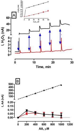 (A) Typical in vitro data obtained for a 0 to 100 µM H2O2 calibration using H2O2 blank electrode (black trace) and catalase electrode (red trace). Blue arrows indicate addition of 20 µM H2O2 aliquots. Inset: Current concentration profiles for H2O2 calibration on H2O2 blank electrode (n = 39, r2 = 0.99, black trace) and H2O2 catalase electrode (n = 39, r2 = 0.99, red trace). (B) Current concentration profiles for AA calibration (0–1000 µM) on H2O2 blank electrode (n =12, black trace), H2O2 catalase electrode (n = 12, red trace) and unmodified bare platinum (Pt) electrode as comparison (n = 24, r2 = 0.99, dashed trace). All concentration profile data are presented as mean ± SEM.