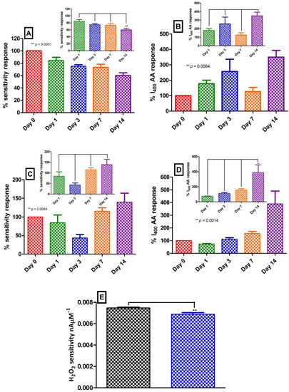 Similarly, H2O2 catalase electrodes (see Figure 2D) demonstrated a significant difference (p < 0.01, one-way ANOVA, n = 4) across Day 0 (100%), Day 1 (73 ± 5%), Day 3 (111 ± 12%), Day 7 (157 ± 16%) and Day 14 (389 ± 101%) for 400 µM AA. Further, a significant difference (p < 0.05, one-way ANOVA, n = 4) across Day 0 (100%), Day 1 (83 ± 7%), Day 3 (129 ± 19%), Day 7 (192 ± 23%) and Day 14 (556 ± 195%) at 1000 µM AA was also noted. Bonferroni post hoc analysis identified that Day 14 differed significantly from Day 1 (p < 0.01), however, no significant difference was observed among Day 1, Day 3 and Day 7 for both 400 µM (see Figure 2D inset) and 1000 µM (data not shown). Collectively, these findings from the H2O2 biosensor indicate that the biosensors performance remains stable during Days 1–7 of tissue homogenate exposure, beyond this some uncertainty exists concerning H2O2 blank electrode sensitivity and H2O2 catalase electrode selectivity. These assumptions will be revisited later during chronic in vivo recordings.