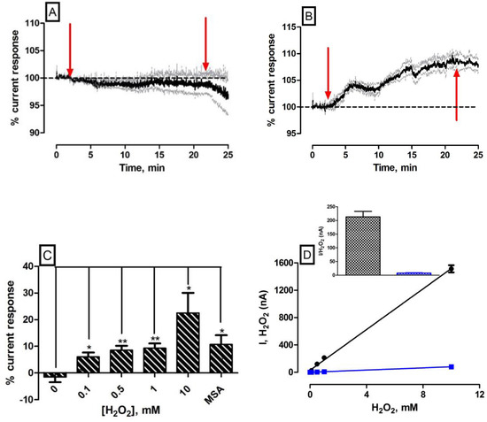 It is critical to validate the ability of the biosensor to measure endogenous levels of H2O2 present within the striatum. The local delivery of the glutathione peroxidase inhibitor MSA was investigated to determine the H2O2 biosensors ability to measure alterations in the concentration of endogenously available H2O2. Glutathione peroxidase is considered to be an extremely important antioxidant enzyme in the brain with high neuroprotective characteristics [10,33] primarily attributed to the degradation of H2O2 [8,9,10]. Local perfusions of MSA resulted in a significant increase (p < 0.05) in subtracted amperometric percentage current response (11 ± 3%, n = 3), compared against control aCSF response recorded at the biosensor surface supporting this assumption (see Figure 3C, Figure S2E and F and Table 1). This supports work undertaken by others whereby the local perfusion of MSA into the striatum of freely moving rats produced an increase in current measured by the amperometric H2O2 biosensor [18]. Furthermore, Li and colleagues reported that local infusion of MSA in anaesthetised rats resulted in an increase in electrochemical H2O2 current measured at their polymer modified microelectrode surface [15].