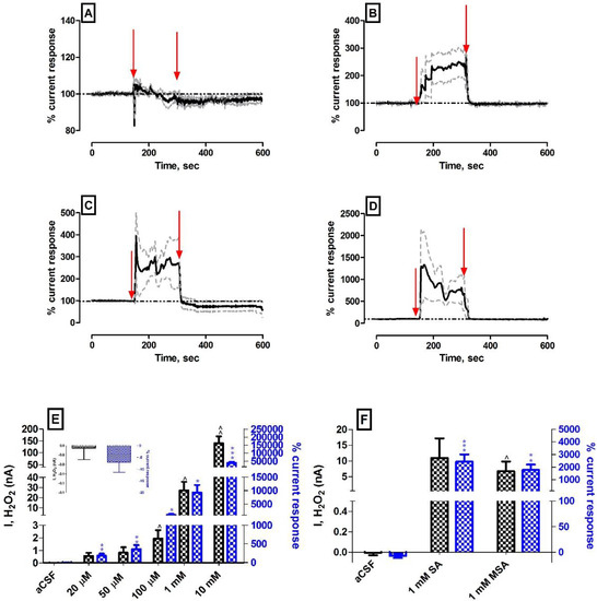 Averaged raw data percentage response of subtracted current from H2O2 biosensor co-implanted with a microinfusion probe in the striatum of anaesthetised NOD SCID mice (n = 5) to: (A) infusion of aCSF; (B) infusion of 20 µM H2O2/aCSF; (C) infusion of 50 µM H2O2/aCSF; and (D) infusion of 100 µM H2O2/aCSF. Red arrows indicate start/end of 150-s infusion. Mean percentage current response represented by black trace, percentage error represented by grey trace. Dose effect of infusion of: (E) 0–10 mM H2O2/aCSF (n = 5); and (F) 1 mM sodium azide (SA) and MSA (n = 3) on subtracted H2O2 current. Current (left y-axis) and percentage current response (right y-axis) data represented as mean ± SEM. ^ and * denote level of significance for currents and percentage currents respectively.