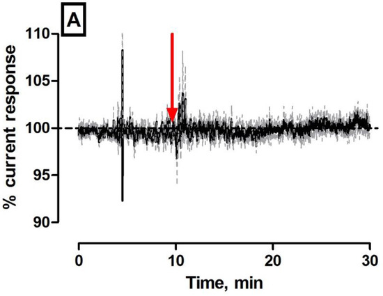 As we alluded to earlier, local perfusion through co-implanted microdialysis probes has been utilised previously to administer exogenous concentrations of the target analyte and characterisation compounds directly to the vicinity of the brain incorporating the implanted amperometric sensor in freely moving rats [18,27]. The experiments described within this body of work using this characterisation technique were performed exclusively in anaesthetised mice. The principal justification being that the mouse model is not suitable to combine microdialysis probes and amperometric sensors in awake subjects due to obvious size constraints. All local administrations occurred using aCSF as the vehicle; therefore, it was imperative to investigate the effect of the control perfusate on the subtracted amperometric signal. Figure 3A illustrates the effect of a 20-min perfusion on the amperometric signal (see Supplementary Material Figure S1A,B for individual electrode responses following perfusion). The subtracted amperometric current ∆I (−73 ± 80 pA, n = 4) was not significantly different (p = 0.49) from pre-perfusion levels and corresponded to a percentage change of −2 ± 2%. In Supplementary Figure S1B, it is obvious that both electrode currents decreased from baseline over the course of the perfusion. This was attributed to the net diffusion of endogenous species located around the microdialysis probe across the membrane and into the perfusate/dialysate. Notwithstanding this, the overall subtracted current only deviated slightly from pre-perfusion levels indicating a negligible effect of control administrations on the amperometric response. The current returned towards the pre-perfusion baseline level upon cessation of the perfusate (data not shown).