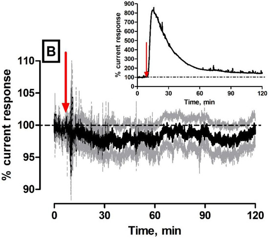 In vivo characterisation compounds utilised during long term recordings were prepared using 0.9% saline solution and administered by intraperitoneal injection in a volume of 1 mL·kg−1. Therefore, it was imperative to characterise the sensor response to control saline injections. The averaged raw data current response following saline administration is detailed in Figure 5A (n = 6). Briefly, the subtracted current from the H2O2 biosensor was 35 ± 17 pA which corresponds to a 1 ± 2% deviation in amperometric current that reached a maximum response after 4 ± 1 min and returned to basal levels after 9 ± 2 min. Similar short-lived transient effects following control saline injections have been reported previously using amperometric sensors in the striatum of freely moving mice [19] and rats [27,42].