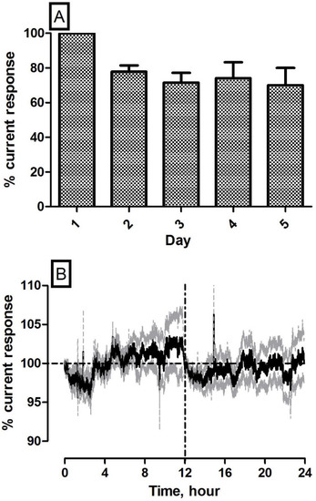 (A) Average percentage baseline in vivo data (n = 6) for subtracted H2O2 biosensor recorded in the striatum of NOD SCID mice. Percentage current response data represented as mean ± SEM. (B) Averaged 12-h raw data percentage response (lights on (0–12 h), n = 14/7), lights off (12–24 h), n = 17/7) of subtracted H2O2 current from biosensors implanted in the striatum of NOD SCID mice. Mean percentage current response represented by black trace, percentage error represented by grey trace.