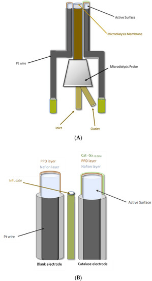 Graphical illustration of: (A) H2O2 biosensor/microdialysis probe construct (ca. 600–650 µm); and (B) H2O2 biosensor/microinfusion probe construct (ca. 250–300 µm).