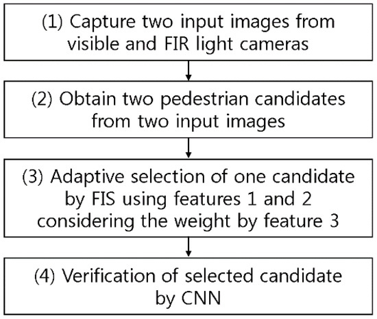 However, these methods may increase the processing time and computational complexity as they have to take into account both visible light and FIR camera images, and process the convolutional neural network (CNN) twice [13]. In order to overcome these limitations, our research suggests a method that is able to detect the pedestrians under varying conditions. The proposed method is more reliable than a single camera-based method, reduces the complexity of the algorithm, and requires less processing time compared to the methods using both visible light and FIR camera images. This is because our method adaptively selects one candidate between two pedestrian candidates derived from visible light and FIR camera images based on a fuzzy inference system (FIS). To enhance the detection accuracy and processing speed, only the selected one candidate is verified by the CNN.