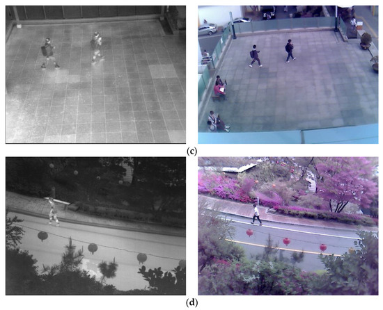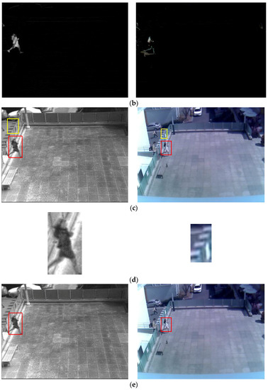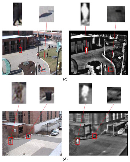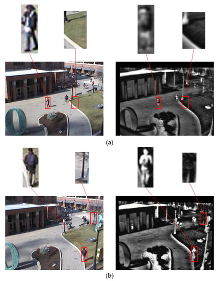The fourth experiment is based on the open database (OSU color-thermal database) [55] such that a fair comparison can be done by other researchers. As shown in Figure 12, OSU color-thermal database is an image gained by the FIR camera and visible light camera in the fixed outdoor with various environmental factors.