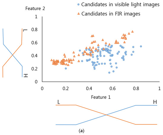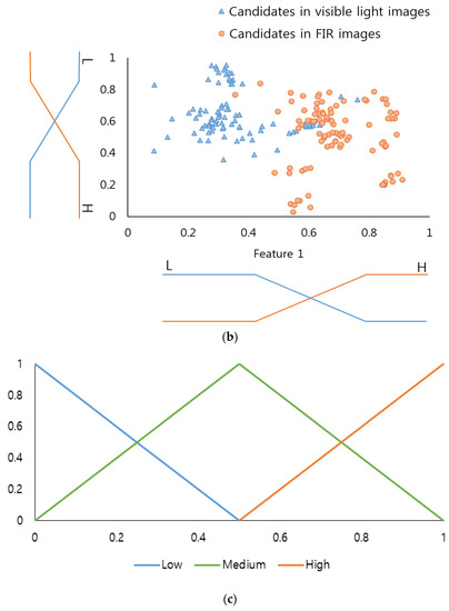 For instance, as listed in Table 2a, when “feature 1” and “feature 2” are “Low” (a lower mean value) and “High” (a higher mean value), respectively, the difference between the pedestrian and the background of the FIR light images is larger than that of the visible light image. Therefore, the output value becomes “High” meaning that the candidate of the FIR light image is selected. However, the opposite case implies that the difference of the visible light image is larger than that of the FIR light image. The output value becomes “Low” which in other words implies that the candidate of the visible light image is selected. If the “feature 1” and “feature 2” are both “Low” or “High”, it is difficult to determine which candidate is more desirable (between the two candidates of visible light and FIR light images), giving the output a “Medium” Value.
