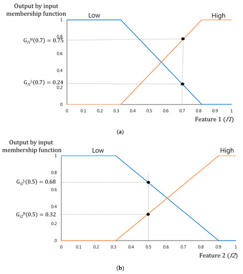 Example of obtaining outputs by input membership functions. (a) Output of “Feature 1”. (b) Output of “Feature 2”.