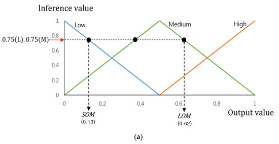 Therefore, the final output value of the FIS will be calculated through various defuzzification and the output membership function with its input of the inference values as shown in Figure 5. This study employed the smallest of maximum (SOM), the middle of maximum (MOM), the largest of maximum (LOM), Bisector, and Centroid methods, most widely used among various defuzzification methods [32,33,34]. Among those, the SOM, MOM, and LOM methods establish the FIS output values by maximum inference values among many inference values. The SOM and LOM methods establish the final output values using the smallest and largest values, which are gained by maximum inference. The MOM method uses the average value of the smallest and largest as the final output value. Figure 5a is an example of a defuzzification process based on the inference values by Max rule of Table 3 (0.32(H), 0.68(M), 0.75(L), and 0.75(M)). This figure only uses these values as its maximum inference values are 0.75(L) and 0.75(M). Therefore, as shown in Figure 5a, two output values (0.13 and 0.62) are produced by SOM and LOM methods, and their average value is gained as (0.375 = (0.13 + 0.62)/2) by MOM method.