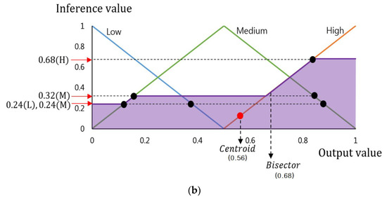 Bisector and centroid methods are the means to determine the FIS output value by using all the inference values. The centroid method determines the FIS output value based on the geometric center of the area from the area (the purple colored area of Figure 5a) defined by all the inference values. The bisector method identifies the FIS output value based on the line dividing the defined area into two having the same size. Figure 5b is an example of a defuzzification process based on the inference values by Min rule of Table 4 (0.24(L), 0.24(M), 0.32(M), and 0.68(H)), which produces two output value (0.56 and 0.68) by the centroid and bisector methods.