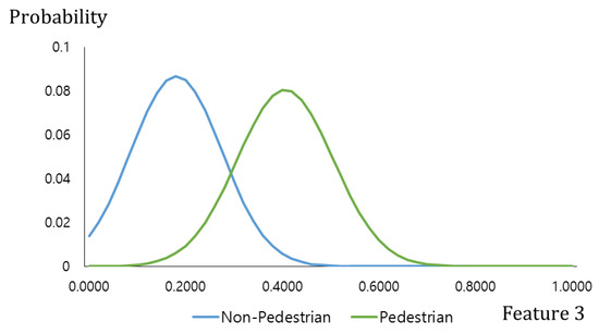 Figure 6 describes two distributions of “feature 3”, produced from the pedestrian and the non-pedestrian data used in Figure 3a,b by using a Gaussian fitting. Similar to the difference image of Figure 2b, the gradient magnitude of the pedestrian candidate is generally higher than that of the non-pedestrian candidate. Therefore, the pedestrian distribution is on the right side of the non-pedestrian distribution as shown in Figure 6.